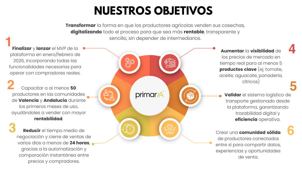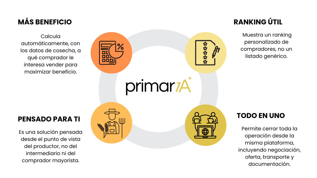 Primar-IA es la primera lonja digital que conecta a productores agrícolas y compradores en tiempo real, de forma directa, transparente y sin intermediarios innecesarios.